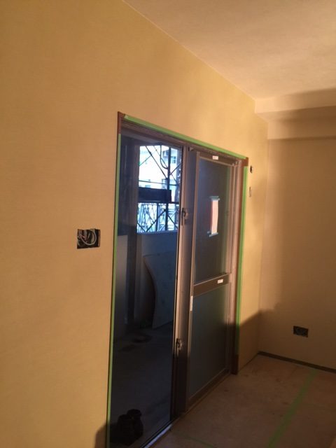 一部クロス貼が始まりました。↓ まだ照明が来ていないので印象がはっきりとわかりません。