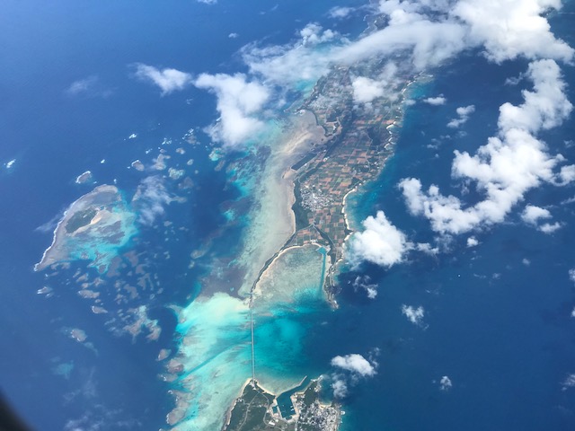 ↓石垣島ではありませんが飛行機から見える宮古島です。青のグラデーションがとってもきれいです…。