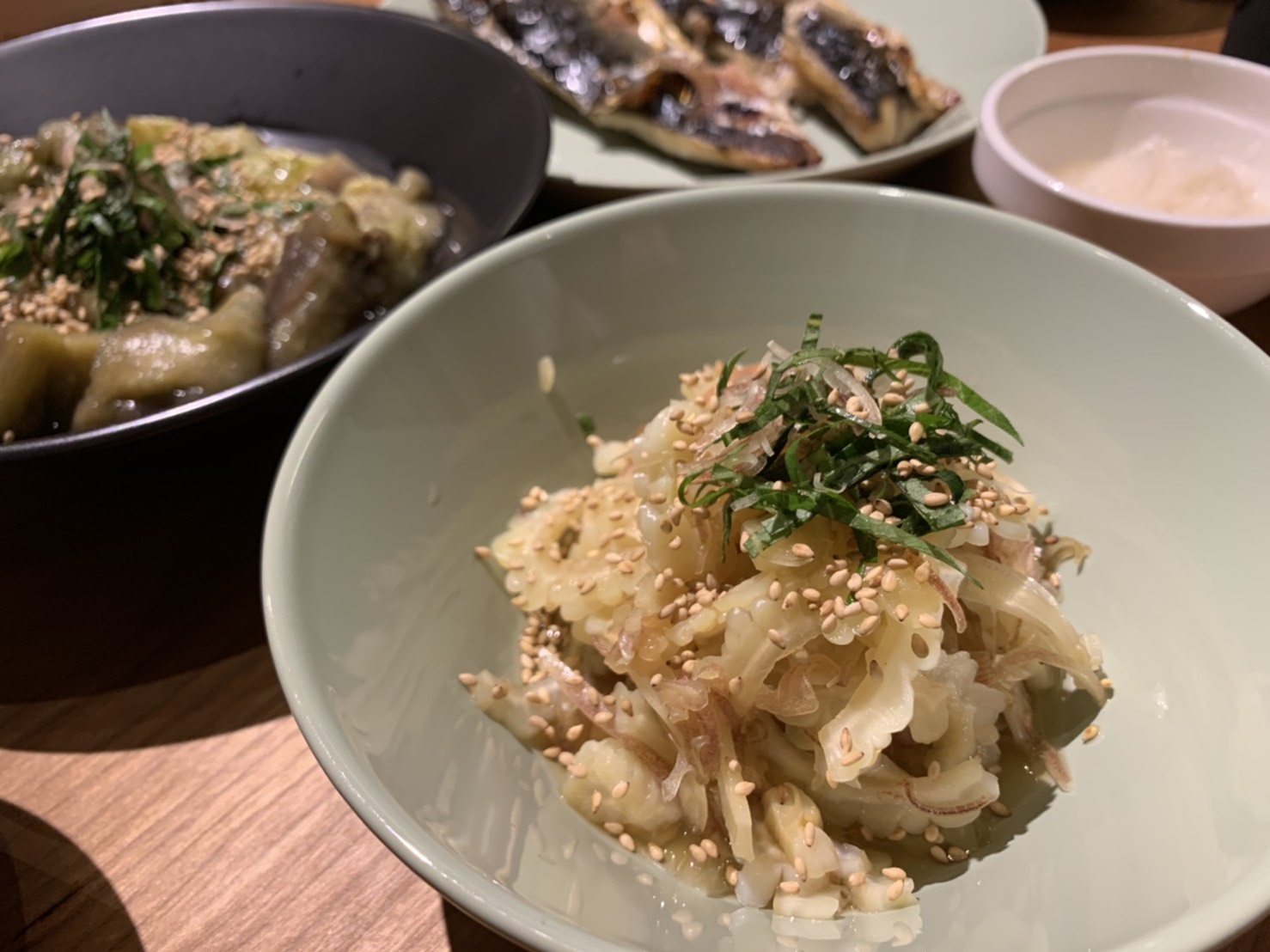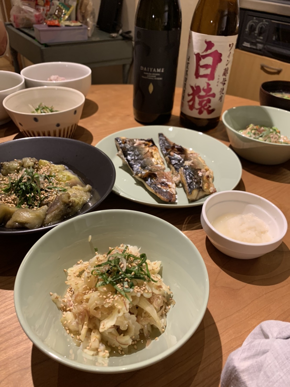 ↓本日のメニューは雑穀米、なめこの味噌汁、サバの焼き魚、焼き茄子の煮浸し、ねばねば和え、白ゴーヤーの冥加和え、焼酎です!